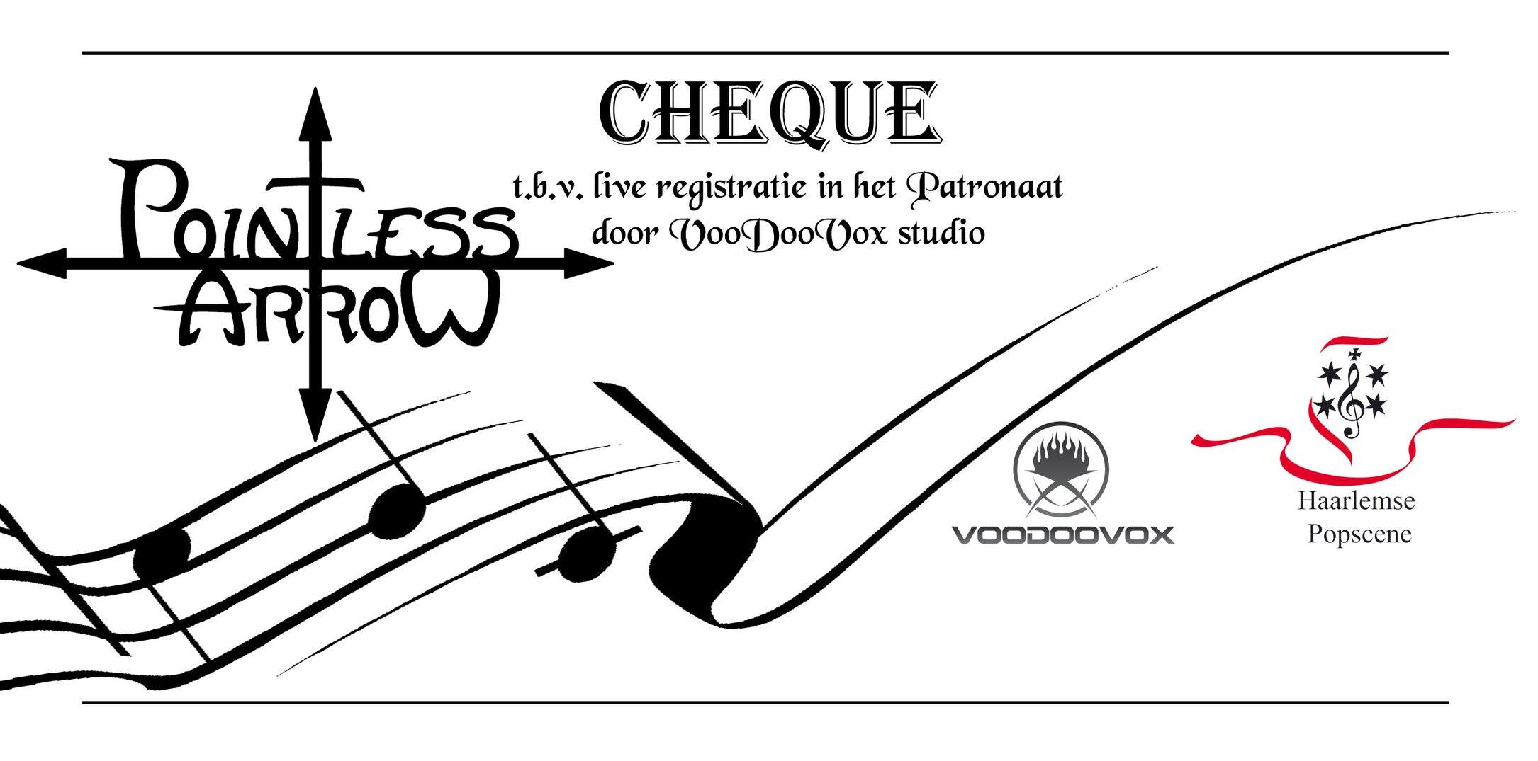 ‘Pointless Arrow’ kreeg de cheque daarom, aan het eind van een prima Haarlemse Popscene-avond met ‘Phil’s neighbours’ en Rutger van der Wulp, bij verstek uitgereikt, door Joost Verhagen en Voodoovox-eigenaar Jeroen Rikkers.